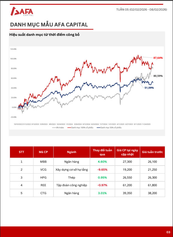 Chiến lược danh mục: Trong tuần 02/02 – 08/02, thị trường được kỳ vọng vận động đi ngang và giằng co quanh vùng 1.800 điểm khi tâm lý nhà đầu tư duy trì trạng thái thận trọng trước kỳ nghỉ Tết. Diễn biến này phản ánh quá trình tích lũy và tái cân bằng cung – cầu sau nhịp điều chỉnh kỹ thuật trước đó. Chiến lược danh mục ưu tiên giữ ổn định tỷ trọng cổ phiếu – tiền mặt ở mức 80% – 20%, tập trung nắm giữ các cổ phiếu có nền tảng cơ bản tốt, thanh khoản ổn định và triển vọng tăng trưởng rõ ràng, đồng thời hạn chế mua đuổi, tận dụng các nhịp rung lắc trong biên độ hẹp để cơ cấu danh mục và kiểm soát rủi ro.