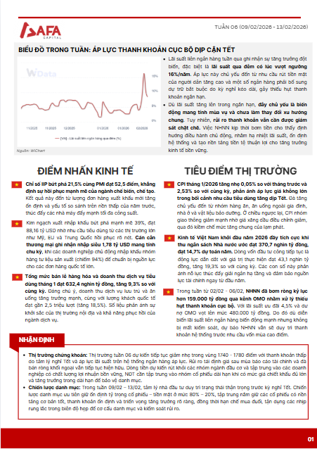 Thị trường chứng khoán: Thị trường tuần 06 dự kiến tiếp tục giảm nhẹ trong vùng 1740 – 1780 điểm với thanh khoản thấp do tâm lý nghỉ Tết và áp lực lãi suất trên hệ thống ngân hàng áp lực. Rủi ro tái định giá sau mùa báo cáo tài chính và đà bán ròng khối ngoại vẫn tiếp tục hiện hữu. Dòng tiền dự kiến rút khỏi các nhóm ngành đầu cơ và tập trung vào các doanh nghiệp có chất lượng lợi nhuận bền vững, NĐT cần tập trung vào nhóm cổ phiếu dài hạn khi có mức giá chiết khấu đủ lớn và tăng trưởng trong dài hạn để bảo vệ danh mục.