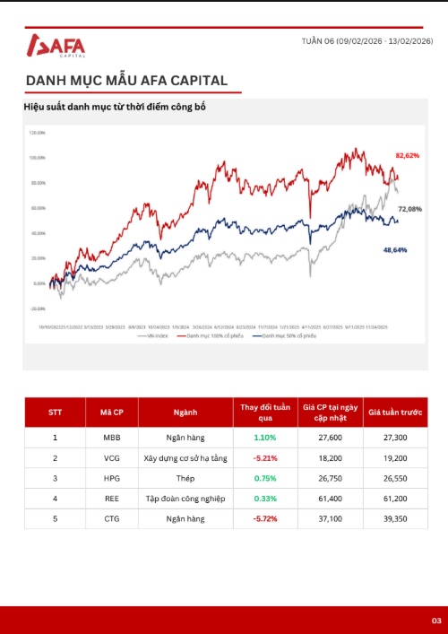 Chiến lược danh mục: Trong tuần 09/02 – 13/02, tâm lý nhà đầu tư duy trì trạng thái thận trọng trước kỳ nghỉ Tết. Chiến lược danh mục ưu tiên giữ ổn định tỷ trọng cổ phiếu – tiền mặt ở mức 80% – 20%, tập trung nắm giữ các cổ phiếu có nền tảng cơ bản tốt, thanh khoản ổn định và triển vọng tăng trưởng rõ ràng, đồng thời hạn chế mua đuổi, tận dụng các nhịp rung lắc trong biên độ hẹp để cơ cấu danh mục và kiểm soát rủi ro.