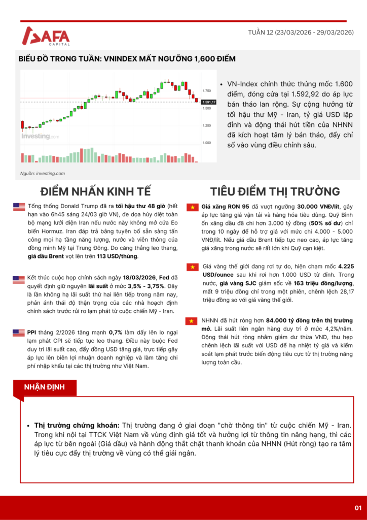 Thị trường chứng khoán: Thị trường đang ở giai đoạn “chờ thông tin” từ cuộc chiến Mỹ – Iran. Trong khi nội tại TTCK Việt Nam về vùng định giá tốt và hưởng lợi từ thông tin nâng hạng, thì các áp lực từ bên ngoài (Giá dầu) và hành động thắt chặt thanh khoản của NHNN (Hút ròng) tạo ra tâm lý tiêu cực đẩy thị trường về vùng có thể giải ngân.