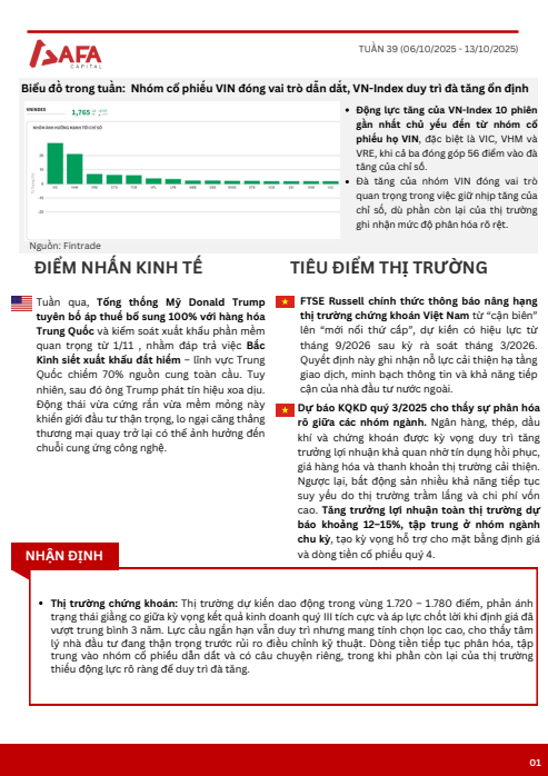 Thị trường chứng khoán: Thị trường dự kiến dao động trong vùng 1.720 – 1.780 điểm, phản ánh trạng thái giằng co giữa kỳ vọng kết quả kinh doanh quý III tích cực và áp lực chốt lời khi định giá đã vượt trung bình 3 năm. Lực cầu ngắn hạn vẫn duy trì nhưng mang tính chọn lọc cao, cho thấy tâm lý nhà đầu tư đang thận trọng trước rủi ro điều chỉnh kỹ thuật. Dòng tiền tiếp tục phân hóa, tập trung vào nhóm cổ phiếu dẫn dắt và có câu chuyện riêng, trong khi phần còn lại của thị trường thiếu động lực rõ ràng để duy trì đà tăng.