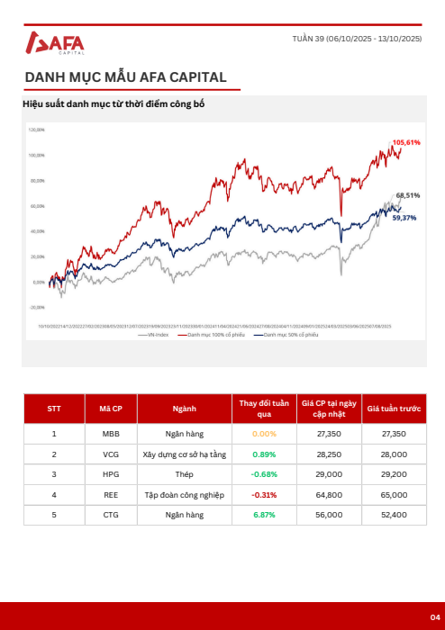 Chiến lược danh mục: Tuần 13/10 – 20/10, với việc dòng tiền vẫn tập trung ở nhóm cổ phiếu dẫn dắt, chiến lược đầu tư được điều chỉnh theo hướng chủ động hơn. Dự kiến hạ tỷ trọng tiền mặt và giải ngân khoảng 5–10% vào các cổ phiếu có thanh khoản tốt và được hưởng lợi từ kết quả kinh doanh quý III tích cực, nhằm tận dụng nhịp tăng ngắn hạn, đồng thời vẫn duy trì sự linh hoạt để phản ứng với biến động thị trường.