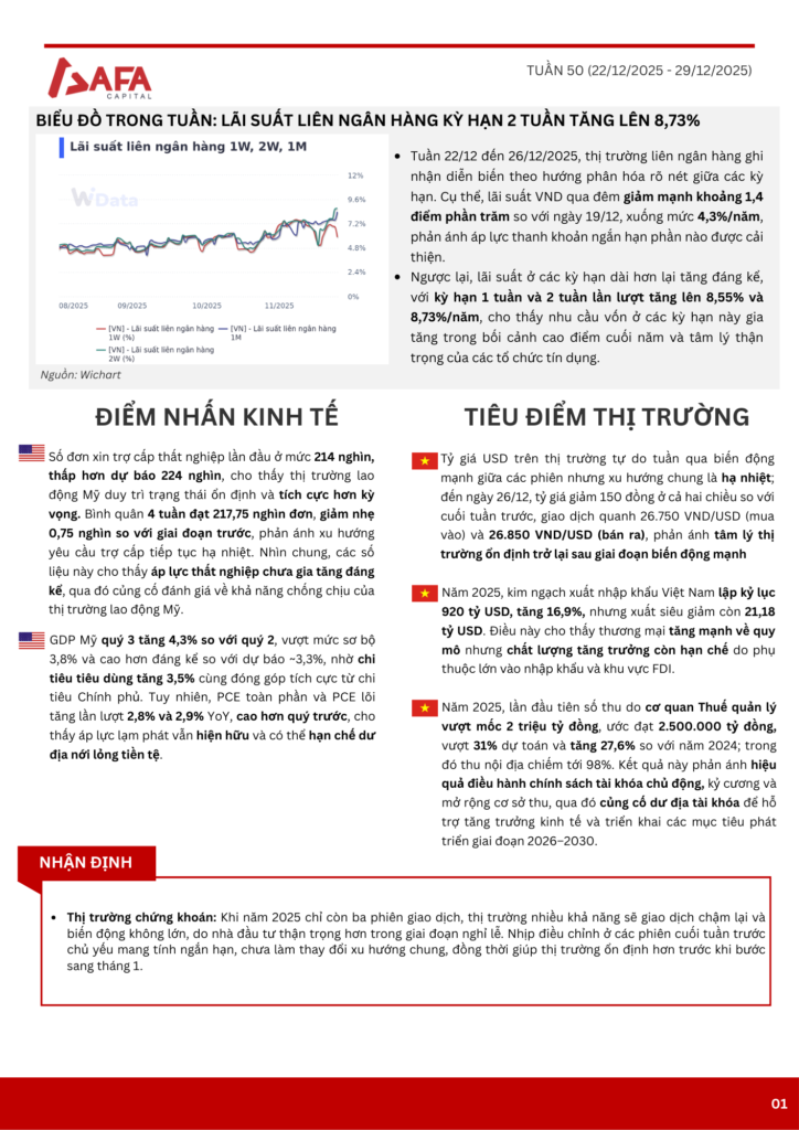 Thị trường chứng khoán: Khi năm 2025 chỉ còn ba phiên giao dịch, thị trường nhiều khả năng sẽ giao dịch chậm lại và biến động không lớn, do nhà đầu tư thận trọng hơn trong giai đoạn nghỉ lễ. Nhịp điều chỉnh ở các phiên cuối tuần trước chủ yếu mang tính ngắn hạn, chưa làm thay đổi xu hướng chung, đồng thời giúp thị trường ổn định hơn trước khi bước sang tháng 1.