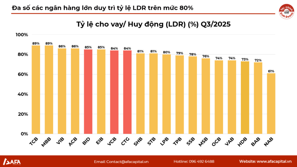 – Hệ quả là tỷ lệ LDR (Dư nợ/Huy động) tại các ngân hàng lớn như MBB, TCB, VIB đều đã vượt mốc 85% – mức cảnh báo về thanh khoản.