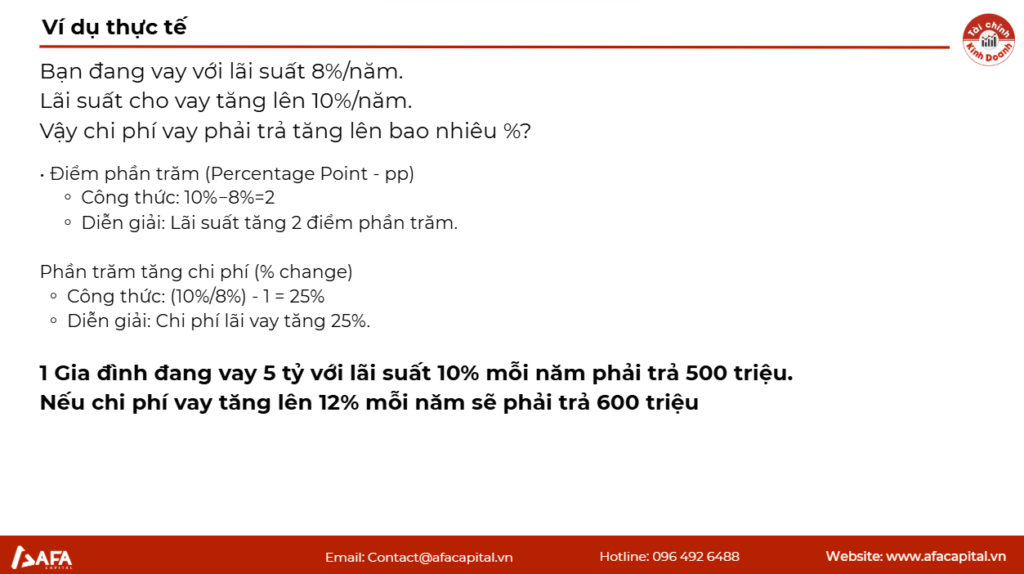 – Phân biệt Điểm phần trăm (pp) và Phần trăm tăng (%): Nếu lãi suất vay của bạn tăng từ 8% lên 10%: