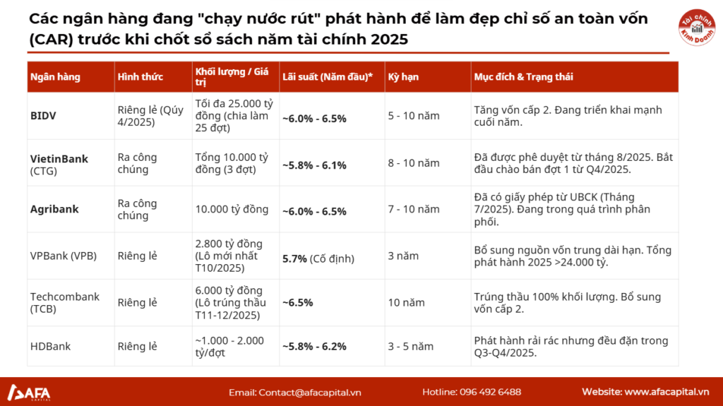 – Phát hành trái phiếu: Hàng loạt ngân hàng như Agribank, VietinBank, BIDV phát hành trái phiếu ra công chúng và riêng lẻ với lãi suất 5,8% – 6,5% để bổ sung vốn cấp 2.