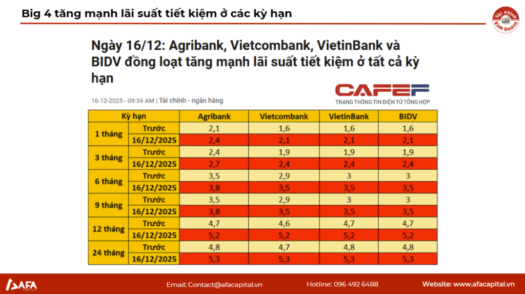 Ngày 16/12/2025 đánh dấu một cột mốc quan trọng trên thị trường tài chính khi nhóm 4 ngân hàng quốc doanh (Big 4) đồng loạt tăng lãi suất huy động. Động thái này không đơn thuần là nghiệp vụ cân đối vốn cuối năm mà đang phát đi những tín hiệu mạnh mẽ về xu hướng dòng tiền trong năm 2026.