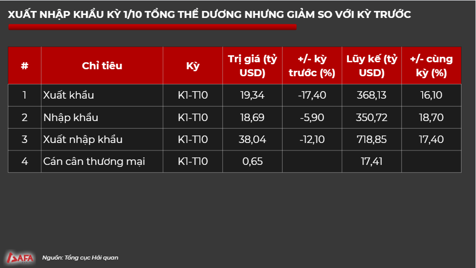 Cán cân thương mại dương ít, mức tăng trưởng âm so với các kỳ trước