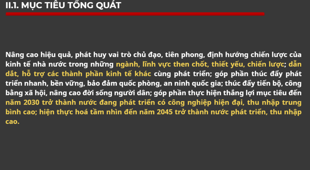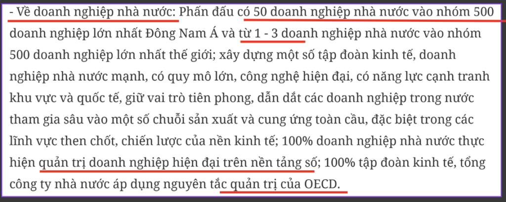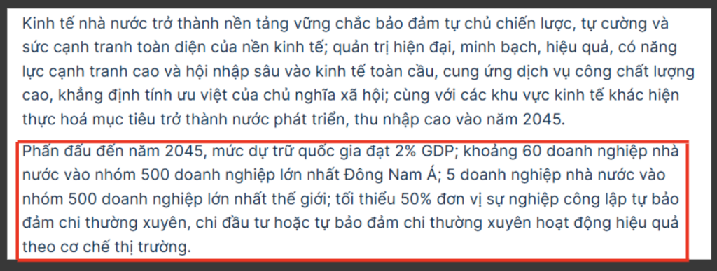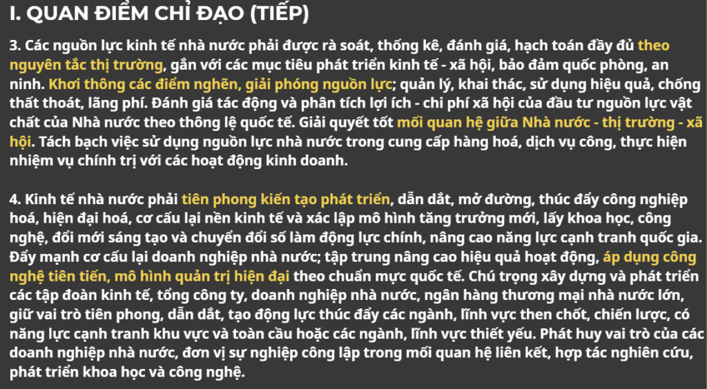 Các doanh nghiệp nhà nước giữ vai trò dẫn dắt nền kinh tế, đặc biệt trong các lĩnh vực chiến lược. Nghị quyết nhấn mạnh cơ chế tăng vốn điều lệ, khuyến khích hợp nhất, đổi mới sáng tạo và chuyển đổi số, nhằm nâng quy mô, hiệu quả và năng lực cạnh tranh. Mục tiêu đến 2030 là đưa các doanh nghiệp lớn vào top 500 doanh nghiệp hàng đầu và các ngân hàng quốc doanh vào top 100 Châu Á.