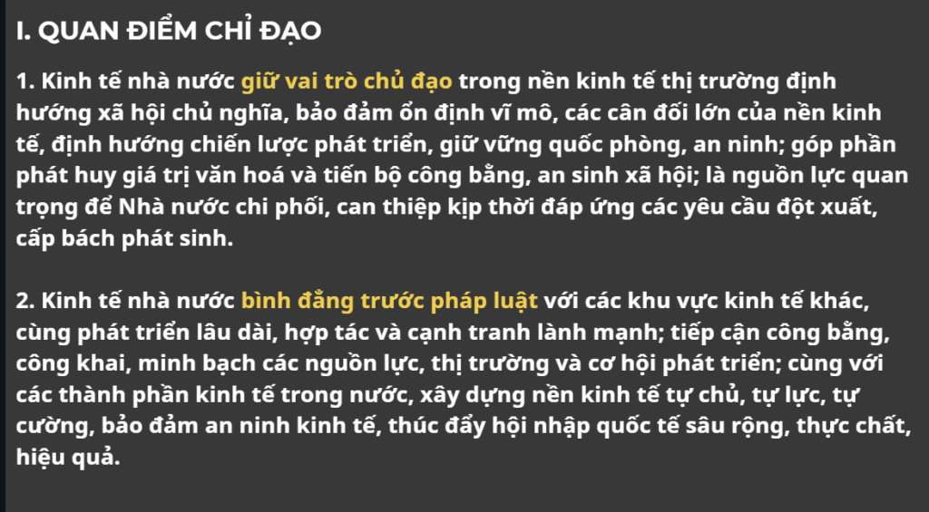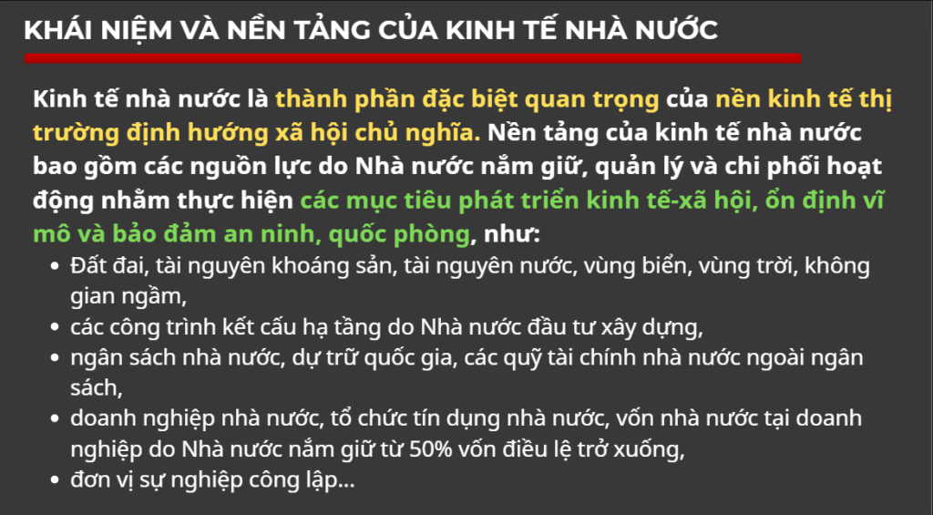 Kinh tế nhà nước giữ vai trò chủ đạo trong nền kinh tế. Điều này có nghĩa là Nhà nước nắm các “đòn bẩy lớn” như ngân hàng, năng lượng, hạ tầng, tài chính công… để giữ ổn định kinh tế vĩ mô, bảo đảm an ninh kinh tế, quốc phòng – an ninh và an sinh xã hội, cũng như can thiệp khi thị trường gặp khủng hoảng.