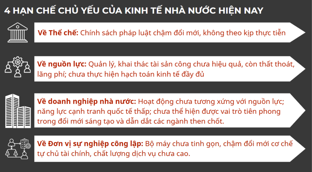 Thứ ba, đối với doanh nghiệp nhà nước, hoạt động chưa tương xứng với quy mô nguồn lực được giao, năng lực cạnh tranh quốc tế còn hạn chế và chưa thể hiện rõ vai trò dẫn dắt, tiên phong trong các ngành then chốt.