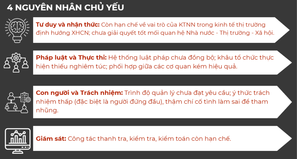 Bên cạnh đó, khung pháp luật và cơ chế thực thi còn thiếu đồng bộ, nhiều luật chồng chéo, tạo ra khoảng trống trách nhiệm và rủi ro lợi ích nhóm. Nghiêm trọng hơn là yếu tố con người và trách nhiệm quản trị, khi trình độ quản lý, năng lực điều hành và đặc biệt là trách nhiệm của người đứng đầu chưa tương xứng với quy mô và vai trò của nguồn lực nhà nước mà họ nắm giữ.