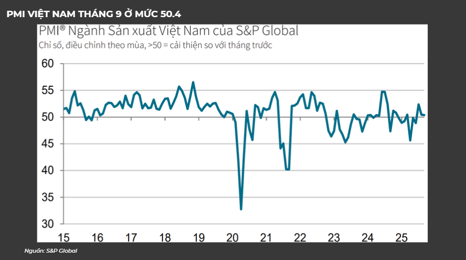 PMI đạt mức 50,4 điểm, phản ánh sự cải thiện nhẹ của hoạt động sản xuất. Tuy nhiên, do đây là chỉ số khuếch tán, kết quả cần được phân tích thận trọng trong bối cảnh nhu cầu tại các thị trường xuất khẩu chủ lực của Việt Nam vẫn còn suy yếu.