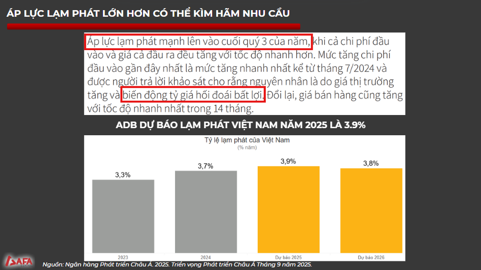 Nguyên nhân của áp lực tăng giá chủ yếu đến từ sự gia tăng của giá hàng hóa trên thị trường quốc tế và biến động tỷ giá hối đoái bất lợi, qua đó làm gia tăng chi phí nhập khẩu và giá đầu vào sản xuất. Trong bối cảnh đó, ADB đã điều chỉnh dự báo lạm phát của Việt Nam năm 2025 lên mức 3,9%, tiến sát ngưỡng mục tiêu 4–4,5%
