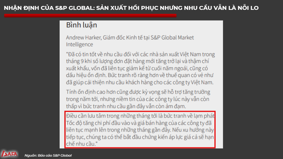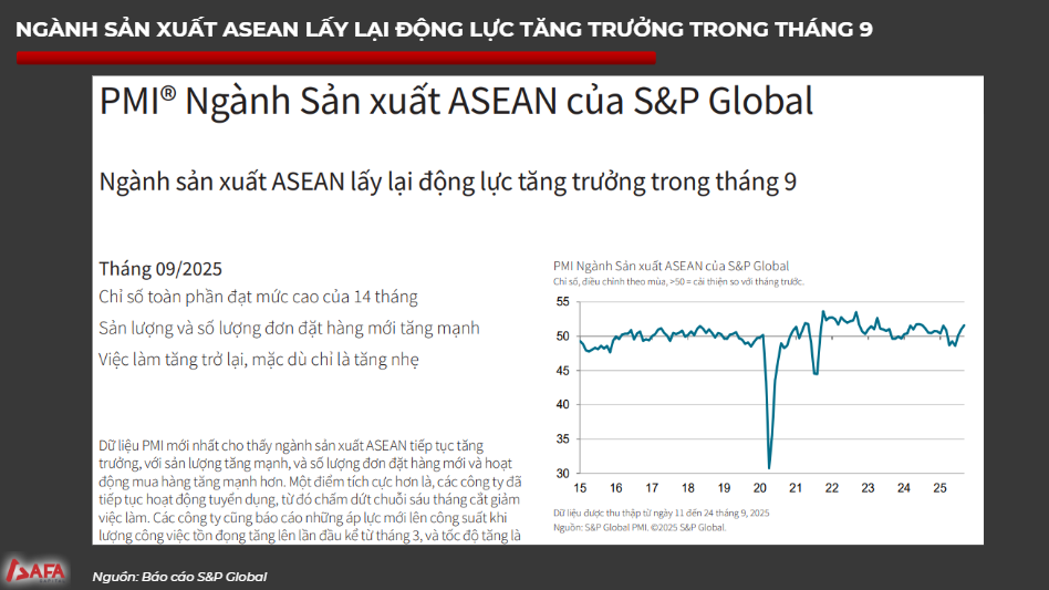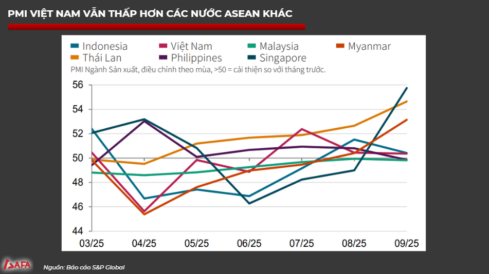Triển vọng của Việt Nam chưa thực sự tích cực khi so sánh trong khu vực. Các quốc gia xuất khẩu cạnh tranh như Indonesia, Malaysia và Thái Lan đã lấy lại được động lực tăng trưởng, trong khi Việt Nam cùng với Philippines và Malaysia vẫn chỉ duy trì quanh ngưỡng 50 điểm PMI, phản ánh sự thiếu bứt phá rõ rệt.