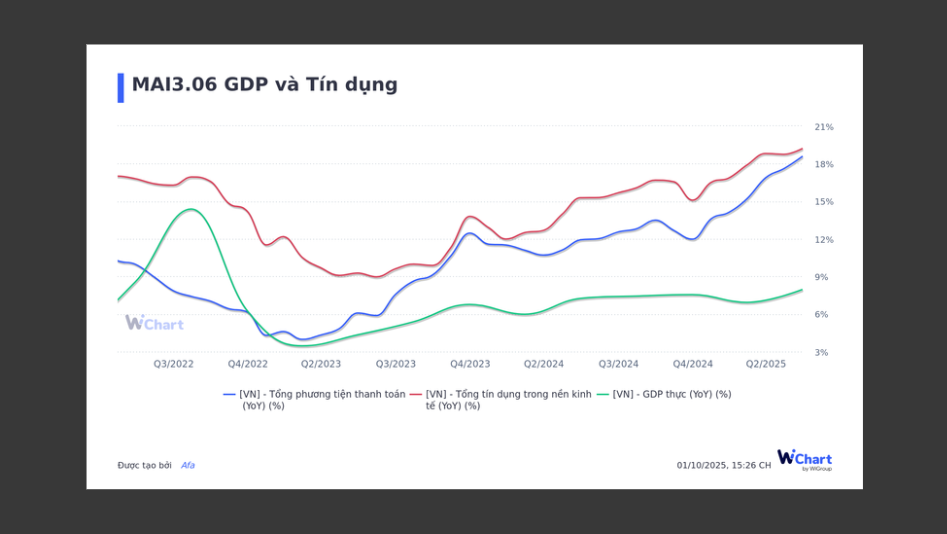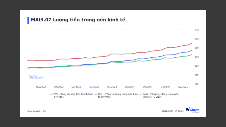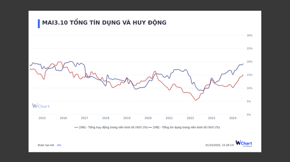 Tổng phương tiện thanh toán (M2) và tăng trưởng tín dụng hiện đã vượt ngưỡng 19%, cao hơn đáng kể so với mức trung bình hằng năm khoảng 14%–15%. Đáng chú ý, tốc độ tăng trưởng tín dụng đang vượt quá tốc độ tăng trưởng huy động vốn (tiền gửi), phản ánh những dấu hiệu mất cân đối và tiềm ẩn rủi ro bất ổn trong hệ thống ngân hàng