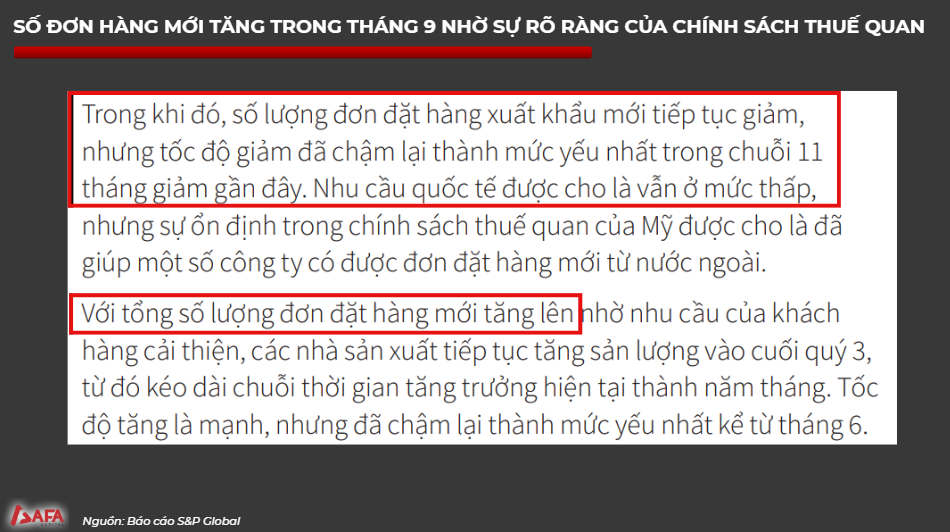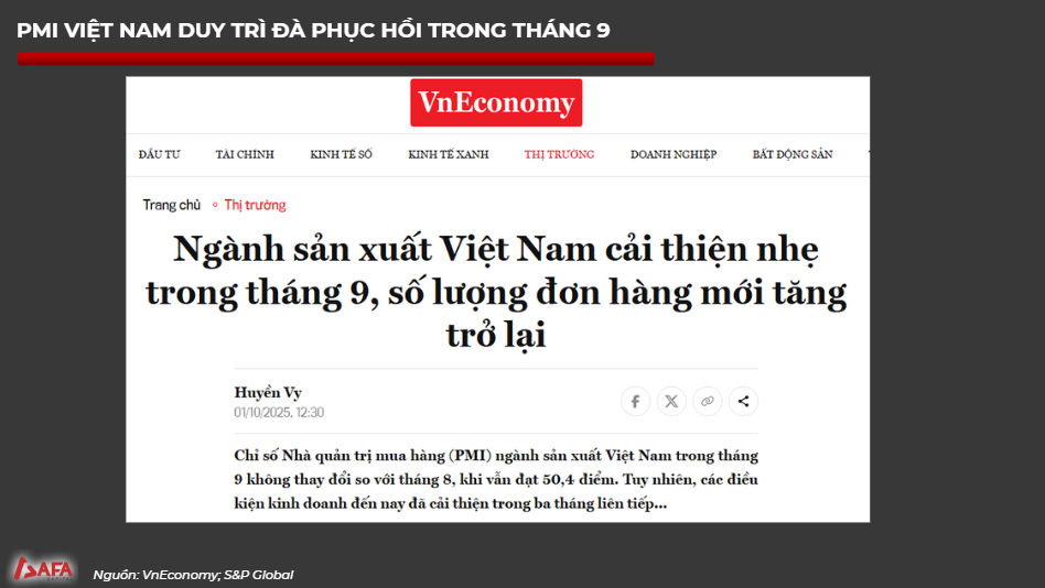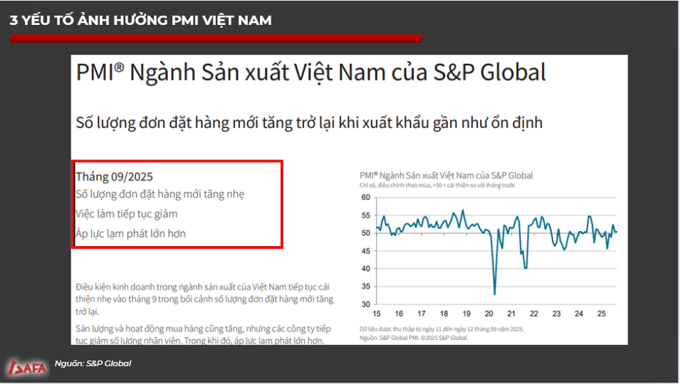 Báo cáo PMI nhìn chung mang tính tích cực, với số lượng đơn đặt hàng mới tăng trở lại trong khi xuất khẩu dần ổn định. Diễn biến này đặc biệt quan trọng bởi xuất nhập khẩu tiếp tục giữ vai trò then chốt đối với tăng trưởng GDP của Việt Nam.