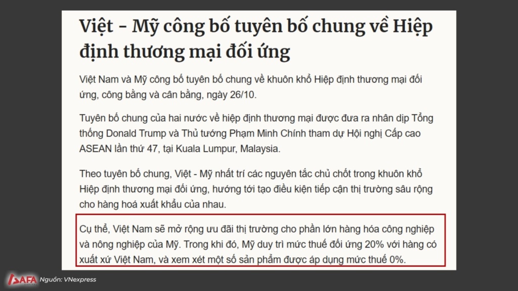 Tổng quan là mở rộng ưu đãi thị trường cho phần lớn hàng hóa công nghiệp và nông nghiệp của Mỹ. Trong khi đó, Mỹ duy trì mức thuế đối ứng 20% với mặt hàng có xuất xứ Việt Nam và xem xét một số sản phẩm được áp dụng mức thuế 0%.
