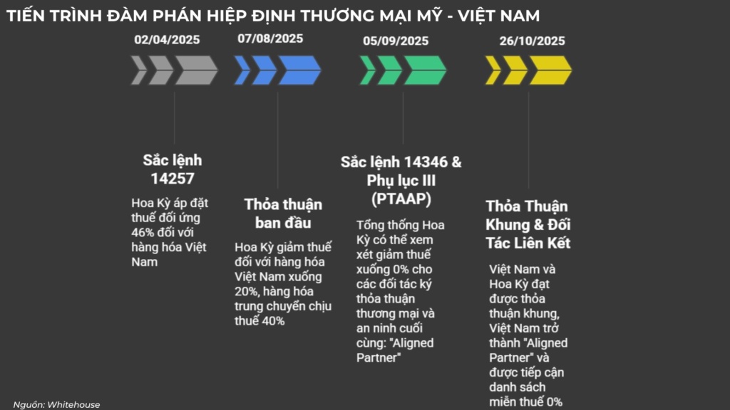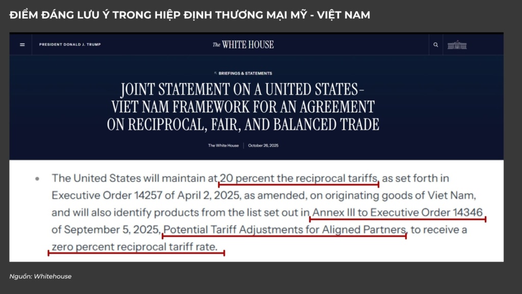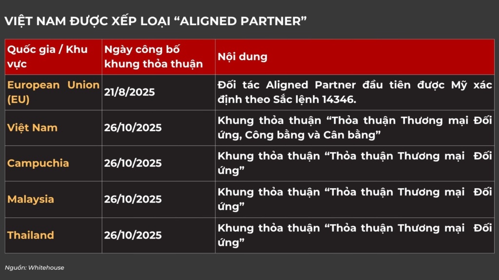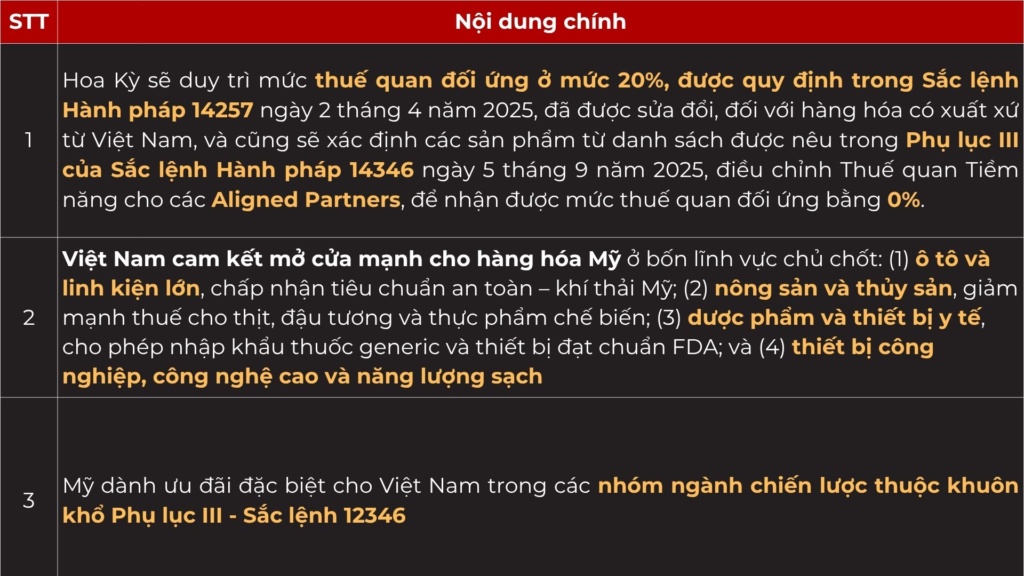 Hiệp định thương mại giữa Việt Nam và Mỹ xác định Việt Nam là Đối tác liên minh (Align Partner) cùng với Campuchia, Malaysia và Thái Lan, tuy nhiên, để hàng hóa được hưởng mức thuế suất 0%, chúng phải là mặt hàng nông nghiệp hay khoáng sản mà Mỹ không thể sản xuất được hoặc không đủ nguồn cung cho nhu cầu nội địa. Nguyên tắc hiệp định là công bằng và cân bằng (fair and balance), đòi hỏi Việt Nam phải cam kết mở cửa mạnh mẽ thị trường cho hàng hóa Mỹ trong bốn lĩnh vực chủ chốt: ô tô và linh kiện, nông sản và thủy sản, dược phẩm và thiết bị y tế, cùng với thiết bị công nghiệp công nghệ cao và năng lượng sạch.