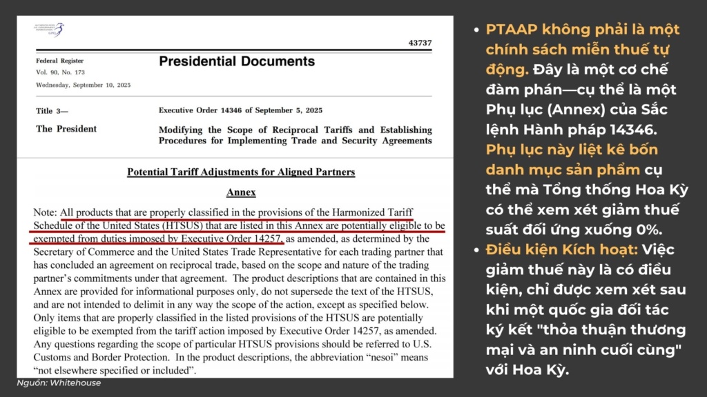 Sắc lệnh 14346 có một phụ lục số 3, tên tiếng Anh là PTAAP (Potential Tariff Adjustment for Aligned Partners) tức là có khả năng điều chỉnh thuế với những đối tác là liên minh