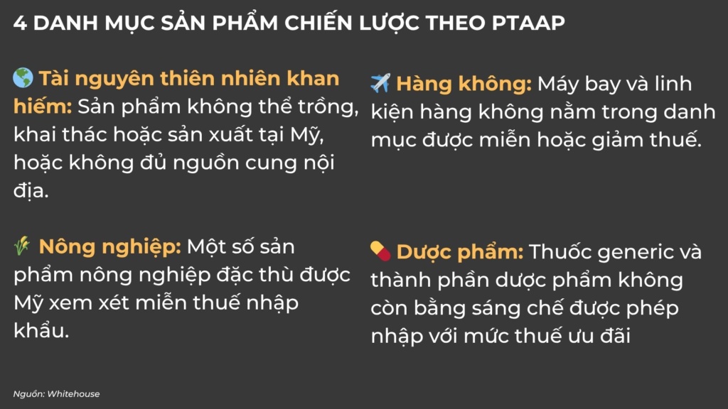 Phụ lục có bốn nhóm hàng cụ thể: 1. Nông nghiệp và tài nguyên thiên nhiên khan hiếm. 2. Hàng không máy bay và linh kiện hàng không. 3. Dược phẩm. 4. Thiết bị công nghiệp công nghệ cao và năng lượng sạch. Đây là những tài nguyên mà Mỹ không thể trồng được, khai thác được, hoặc không đủ cái nguồn cung cho nhu cầu nội địa thì sẽ được gọi là sản phẩm chiến lược