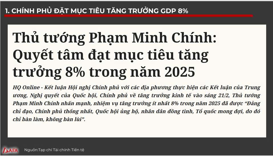 Trong bối cảnh kinh tế toàn cầu nhiều biến động, Chính phủ Việt Nam thể hiện quyết tâm chính trị cao độ với mục tiêu tăng trưởng GDP năm 2025 đạt mức 8%. Tại Hội nghị sáng 21/2, Thủ tướng Phạm Minh Chính đã nhấn mạnh thông điệp đanh thép: “Chỉ bàn làm, không bàn lùi”. Con số 8% không chỉ là chỉ tiêu kinh tế mà còn là nhiệm vụ chính trị được Đảng chỉ đạo và Quốc hội ủng hộ, nhằm tạo đà bứt phá cho giai đoạn cuối của nhiệm kỳ. Động thái này phát đi tín hiệu mạnh mẽ về việc sẽ có các chính sách tài khóa và tiền tệ mang tính hỗ trợ tối đa để kích thích tổng cầu trong năm nay.