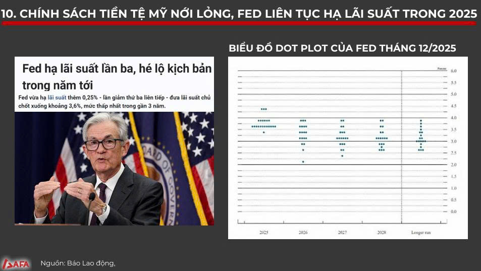Yếu tố hỗ trợ vĩ mô quốc tế quan trọng nhất năm 2025 là việc Cục Dự trữ Liên bang Mỹ (FED) liên tục nới lỏng tiền tệ. FED đã hạ lãi suất lần thứ ba liên tiếp, đưa lãi suất chủ chốt xuống mức 3,6% – thấp nhất trong gần 3 năm. Biểu đồ Dot Plot tháng 12/2025 xác nhận xu hướng giảm lãi suất sẽ còn tiếp tục trong dài hạn. Động thái này giúp giảm áp lực tỷ giá lên VND, tạo dư địa cho Ngân hàng Nhà nước duy trì chính sách tiền tệ nới lỏng để hỗ trợ tăng trưởng 8% như đã đề cập ở trên.