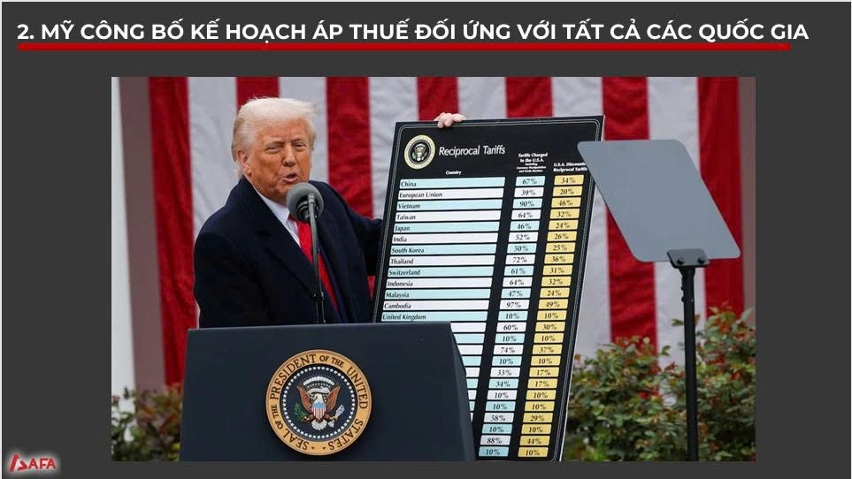 Một điều đáng quan ngại cho xuất khẩu là việc Mỹ công bố kế hoạch áp thuế đối ứng (Reciprocal Tariffs) với tất cả các quốc gia. Dữ liệu cho thấy một kịch bản rủi ro lớn đối với Việt Nam khi mức thuế đối ứng lên tới 46% (tương đương mức thuế mà phía Mỹ cho rằng đang bị áp dụng lên hàng hóa của họ). Nhờ sự mềm dẻo và khéo léo trong các cuộc đàm phán của Chính phủ, Mỹ đã giảm mức thuế xuống còn 20% và mở ra cho Việt Nam nhiều cơ hội trên thị trường quốc tế.
