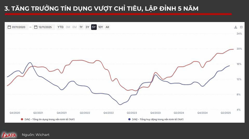 Dòng vốn vào nền kinh tế đang cho thấy sự hấp thụ cực tốt. Tăng trưởng tín dụng đã vượt chỉ tiêu và lập đỉnh cao nhất trong 5 năm trở lại đây. Biểu đồ cho thấy sự bứt tốc mạnh mẽ từ cuối năm 2024, và đến Q2/2025, tốc độ tăng trưởng tín dụng có thể vượt mốc 20%, bỏ xa tốc độ huy động vốn chỉ khoảng 16%. Việc tín dụng tăng trưởng nóng cho thấy niềm tin kinh doanh đã trở lại, các doanh nghiệp đang mạnh dạn tận dụng nguồn vốn rẻ để mở rộng sản xuất. Tuy nhiên, chênh lệch giữa huy động và tín dụng cũng cảnh báo áp lực lên thanh khoản hệ thống ngân hàng.