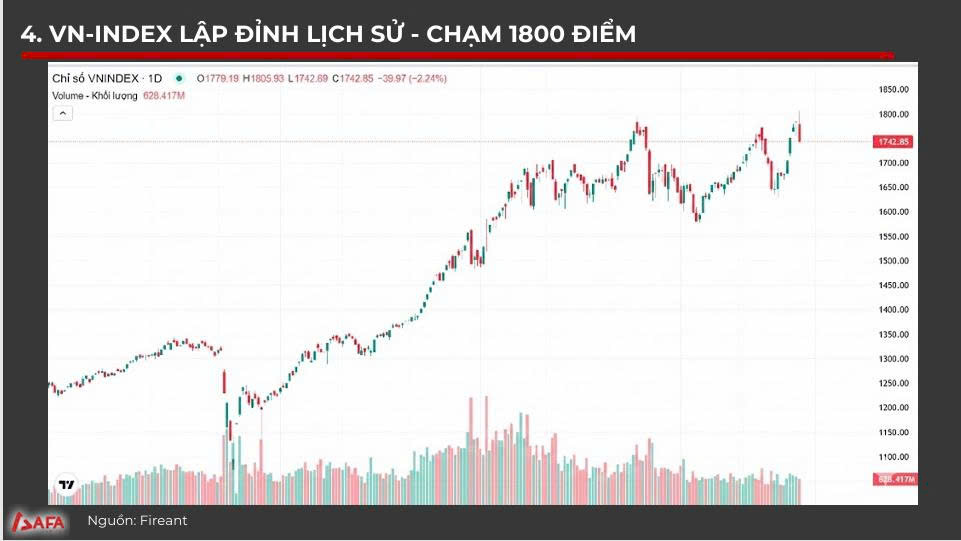 Thị trường chứng khoán Việt Nam đã ghi nhận cột mốc lịch sử khi VN-Index chạm ngưỡng 1.800 điểm. Dữ liệu giao dịch cho thấy chỉ số đã có lúc đạt mức cao nhất là 1.805,93 điểm với thanh khoản bùng nổ đạt hơn 628 triệu cổ phiếu. Mặc dù có áp lực chốt lời khiến chỉ số đóng cửa tại 1.742,85 điểm, nhưng việc chinh phục mốc tâm lý 1.800 điểm xác nhận xu hướng “uptrend” dài hạn mạnh mẽ. Dòng tiền lớn (Smart money) đã nhập cuộc quyết liệt, đẩy định giá thị trường lên một mặt bằng mới, phản ánh kỳ vọng lạc quan của nhà đầu tư vào triển vọng kinh tế 2026-2030.
