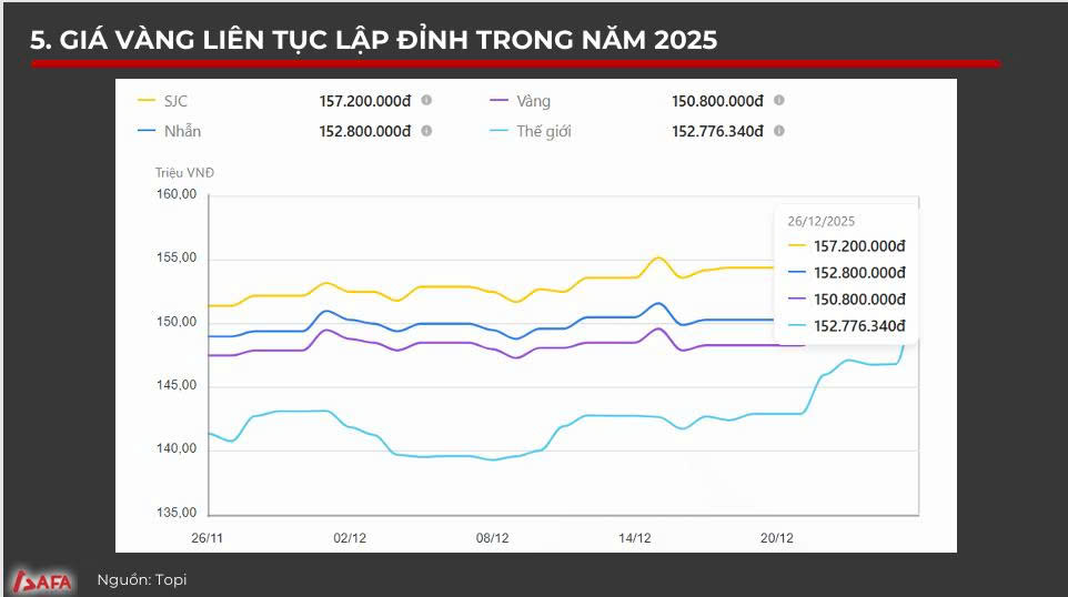 Thị trường vàng năm 2025 chứng kiến đà tăng phi mã và liên tục lập đỉnh mới. Tính đến ngày 26/12/2025, giá vàng miếng SJC đã vọt lên mức 157,2 triệu đồng/lượng, trong khi vàng nhẫn cũng đạt 152,8 triệu đồng/lượng. Đáng chú ý, chênh lệch giữa giá vàng trong nước và giá thế giới (quy đổi khoảng 152,77 triệu đồng) đang ở mức rất thấp, cho thấy sự liên thông chặt chẽ hơn của thị trường.