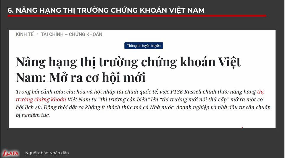 Một bước ngoặt quan trọng cho dòng vốn ngoại: FTSE Russell đã chính thức nâng hạng thị trường chứng khoán Việt Nam từ “Cận biên” (Frontier) lên “Mới nổi thứ cấp” (Secondary Emerging). Đây được coi là cơ hội lịch sử, mở đường cho hàng tỷ USD từ các quỹ ETF và quỹ chủ động phân bổ vào Việt Nam. Tuy nhiên, báo cáo cũng nhấn mạnh đây là thách thức buộc Nhà nước và doanh nghiệp phải nghiêm túc chuẩn bị về tính minh bạch và khung pháp lý để đáp ứng các chuẩn mực quốc tế khắt khe hơn. Sự kiện này là cú hích nền tảng cho định giá lại (re-rating) P/E của toàn thị trường.