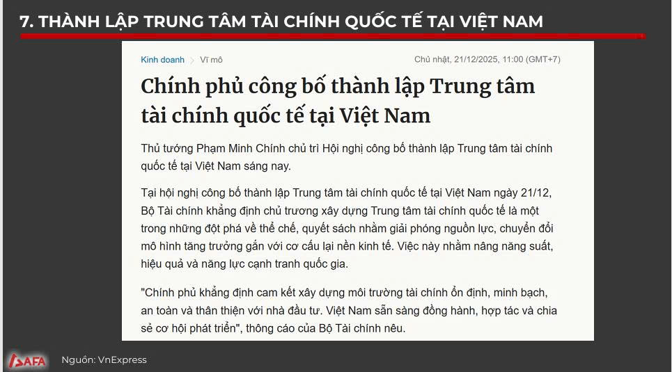 Ngày 21/12/2025, Chính phủ đã chính thức công bố thành lập Trung tâm Tài chính Quốc tế tại Việt Nam. Bộ Tài chính xác định đây là một đột phá về thể chế nhằm giải phóng nguồn lực và chuyển đổi mô hình tăng trưởng. Cam kết của Chính phủ về việc xây dựng một môi trường tài chính “ổn định, minh bạch, an toàn” là tín hiệu rất tích cực. Việc hình thành IFC không chỉ thu hút các định chế tài chính toàn cầu mà còn nâng cao năng lực cạnh tranh quốc gia, tạo tiền đề cho sự phát triển của các dịch vụ tài chính cao cấp (Fintech, Wealth Management) trong tương lai.