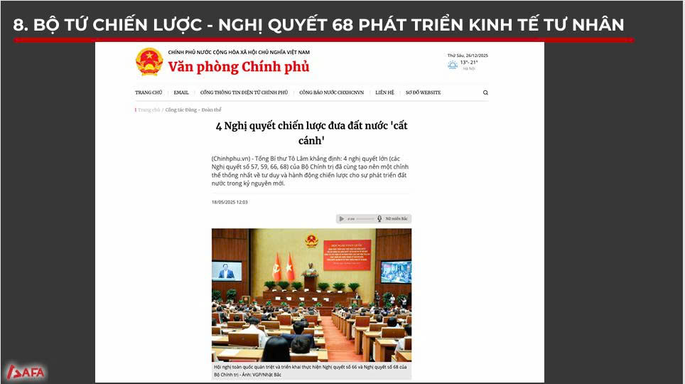 Về mặt chính sách vĩ mô dài hạn, Tổng Bí thư Tô Lâm khẳng định vai trò của 4 nghị quyết lớn (57, 59, 66, 68) tạo nên một chỉnh thể thống nhất cho kỷ nguyên phát triển mới. Đặc biệt, Nghị quyết 68 tập trung vào phát triển kinh tế tư nhân được xem là động lực then chốt. Sự đồng bộ trong tư duy và hành động chiến lược từ cấp cao nhất (“Bộ tứ chiến lược”) giúp củng cố niềm tin của cộng đồng doanh nghiệp vào sự ổn định và nhất quán của môi trường kinh doanh, hứa hẹn làn sóng đầu tư mạnh mẽ từ khu vực tư nhân.