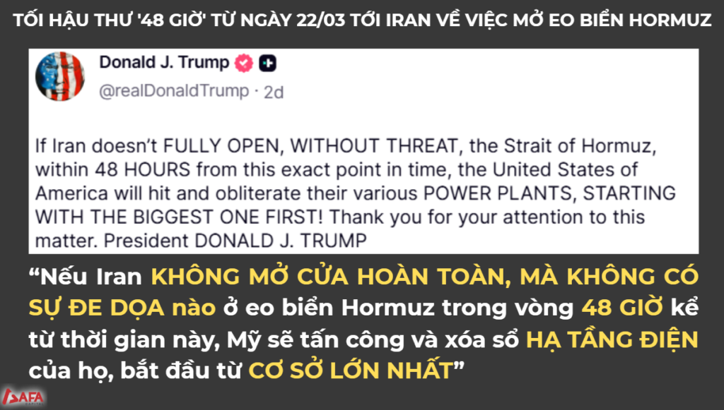 Cụ thể, Mỹ đã đưa ra tối hậu thư yêu cầu Iran mở cửa hoàn toàn Strait of Hormuz trong vòng 48 giờ, kèm theo đe dọa tấn công hạ tầng năng lượng. Tuy nhiên, ngay trước ngưỡng leo thang, phía Mỹ bất ngờ gia hạn thêm 5 ngày với lý do “đàm phán hiệu quả”, dù phía Iran phủ nhận có đối thoại chính thức.