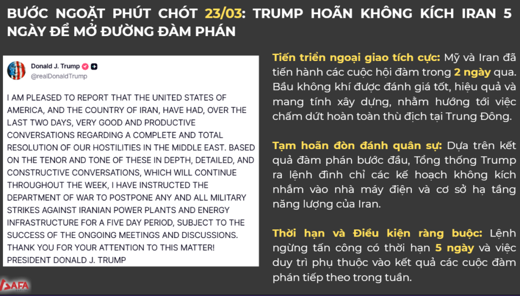 Tạm hoãn đòn đánh quân sự: Dựa trên kết quả đàm phán bước đầu, Tổng thống Trump ra lệnh đình chỉ các kế hoạch không kích nhắm vào nhà máy điện và cơ sở hạ tầng năng lượng của Iran.