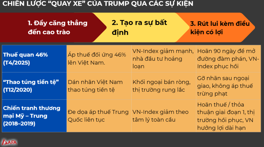 đẩy căng thẳng lên mức cao → tạo áp lực đàm phán → điều chỉnh hoặc rút lui có điều kiện vào thời điểm then chốt.