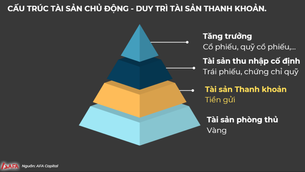 Một điểm mù phổ biến của nhà đầu tư cá nhân là khi cơ hội rõ ràng, lại không còn tiền để giải ngân. Giải pháp là xây dựng tháp tài sản với nền tảng là lớp thanh khoản. Khi cổ phiếu hay tài sản rủi ro điều chỉnh mạnh, lớp này trở thành nguồn vốn tiếp ứng, giúp nhà đầu tư chủ động mua vào thay vì bán tháo. Cấu trúc này loại bỏ tâm lý “đoán đỉnh, đoán đáy” và hướng tới quản lý tài sản bền vững.