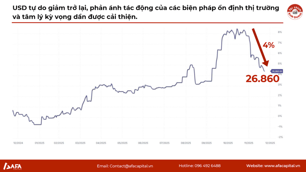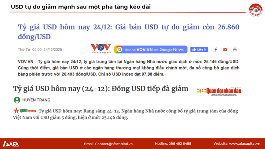 Ngày 24/12/2025 đánh dấu sự gãy xu hướng tăng của USD tự do. Mức giá giảm về 26.860 VND là tín hiệu cho thấy tâm lý găm giữ ngoại tệ đã bị lung lay dữ dội trước các tin tức vĩ mô mới.Sự kiện này diễn ra ngay trong mùa cao điểm thanh toán cuối năm, đi ngược lại quy luật thông thường (cầu ngoại tệ thường tăng cuối năm), cho thấy có sự can thiệp hiệu quả từ chính sách tiền tệ.
