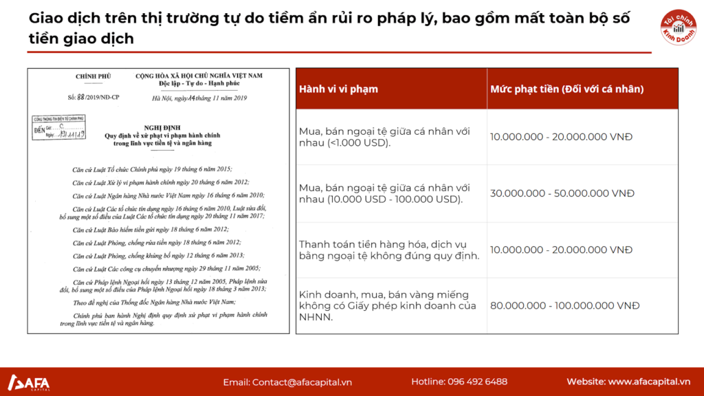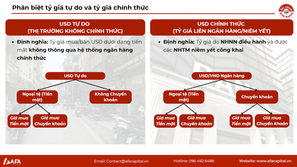 Thị trường tỷ giá được chia tách biệt làm hai phần là Tỷ giá tự do và Tỷ giá của các NHTM niêm yết. Thị trường tự do (thị trường không minh bạch) phản ánh cung cầu thực tế không chịu sự kiểm soát biên độ, thường có phí rủi ro pháp lý cao hơn.Sự chênh lệch giữa giá tiền mặt và chuyển khoản trên thị trường tự do là chỉ báo về nhu cầu “rửa” dòng tiền hoặc thanh toán biên mậu không chính ngạch.