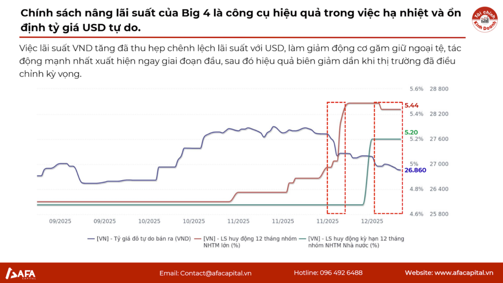 Động thái tăng lãi suất quyết liệt của nhóm Big 4 (Vietcombank, BIDV, Agribank, VietinBank) vào giữa tháng 12 đã nới rộng chênh lệch lãi suất thực giữa VND và USD.Đúng như lý thuyết IRP, khi lãi suất đồng nội tệ tăng, áp lực mất giá giảm đi. Biểu đồ cho thấy ngay khi lãi suất đi lên, tỷ giá lập tức đi xuống. Đây là minh chứng cho hiệu quả của chính sách tiền tệ.