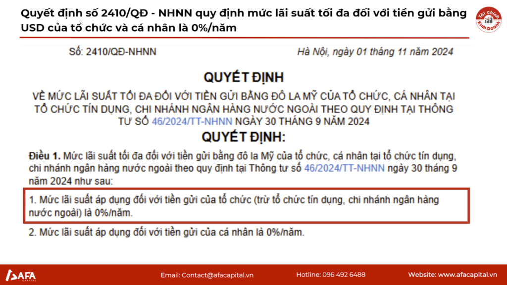 Quyết định 2410/QĐ-NHNN hoặc các văn bản pháp lý quy định trần lãi suất tiền gửi USD là 0%/năm biến USD thành tài sản không sinh lời thụ động. Trong bối cảnh lãi suất VND tăng lên (Big 4 tăng lãi suất), việc nắm giữ USD trở nên tốn kém chi phí cơ hội, thúc đẩy người dân bán USD chuyển sang VND.