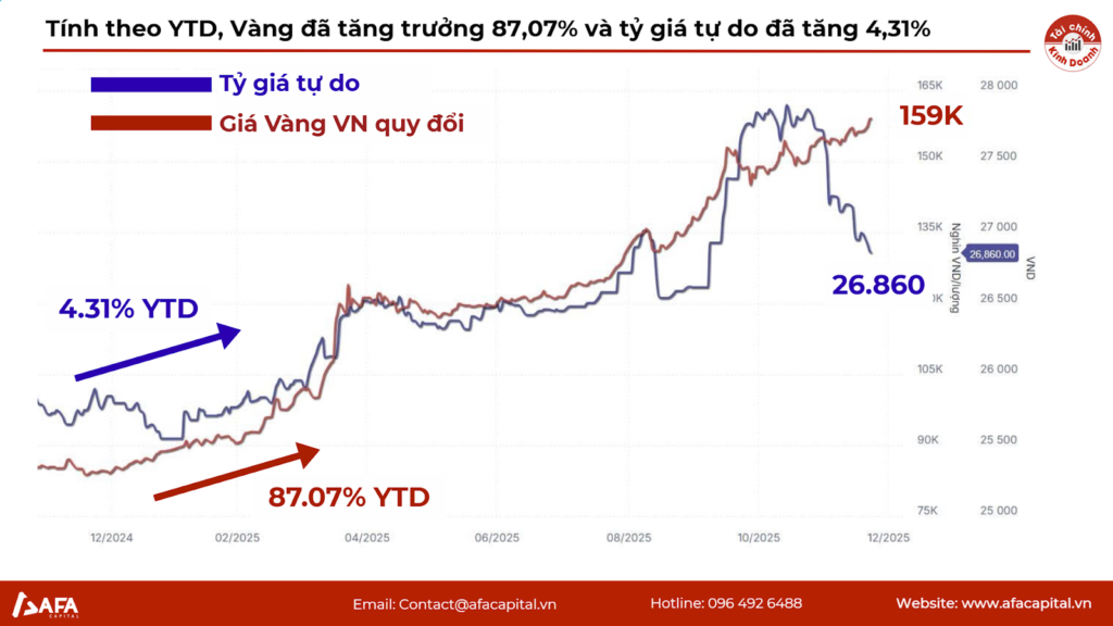 Thông thường Vàng và USD tăng cùng chiều. Tuy nhiên, mức sinh lời của Vàng (gần 90%) đã hút cạn thanh khoản của USD. Dòng tiền thông minh đã bán USD (tài sản tăng trưởng thấp) để “đua lệnh” sang Vàng (tài sản tăng trưởng nóng), gây áp lực bán tháo lên tỷ giá tự do.