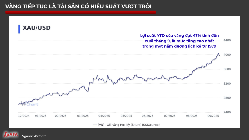 Vàng đã trở thành lớp tài sản phòng thủ nổi bật trong năm nay với lợi suất đạt 47% tính đến cuối tháng 9, phản ánh xu hướng đã từng xảy ra trong giai đoạn lạm phát cao năm 1979