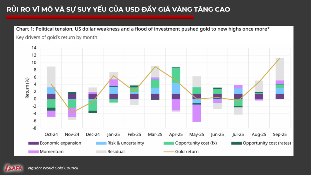 Các yếu tố thúc đẩy đà tăng mạnh của vàng bao gồm rủi ro cao, chi phí cơ hội ngoại hối thấp (do USD yếu), và chi phí nắm giữ thấp (lãi suất thấp); sự hội tụ của các yếu tố này đã giúp vàng vượt mốc 4.000 USD.