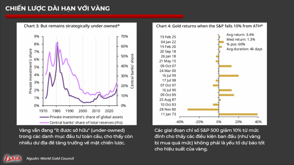Mặc dù các ngân hàng trung ương đã tích lũy vàng mạnh mẽ, nhưng sự sở hữu của các quỹ đầu tư tư nhân (ETF) mới bắt đầu tăng gần đây, cho thấy động lực thị trường và dư địa tăng trưởng còn rất lớn cho vàng