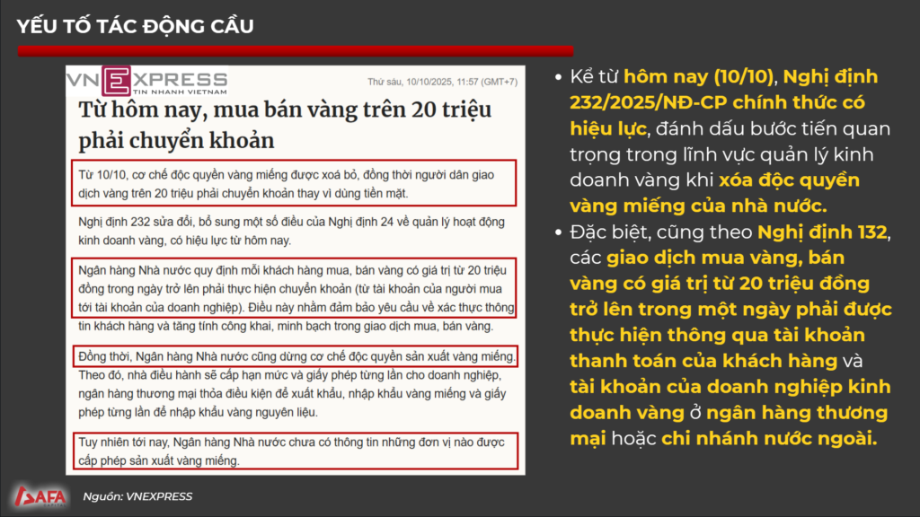 Nghị định 232 chính thức có hiệu lực từ ngày 10/10, quy định các giao dịch mua bán vàng từ 20 triệu đồng trở lên phải thực hiện thông qua tài khoản ngân hàng