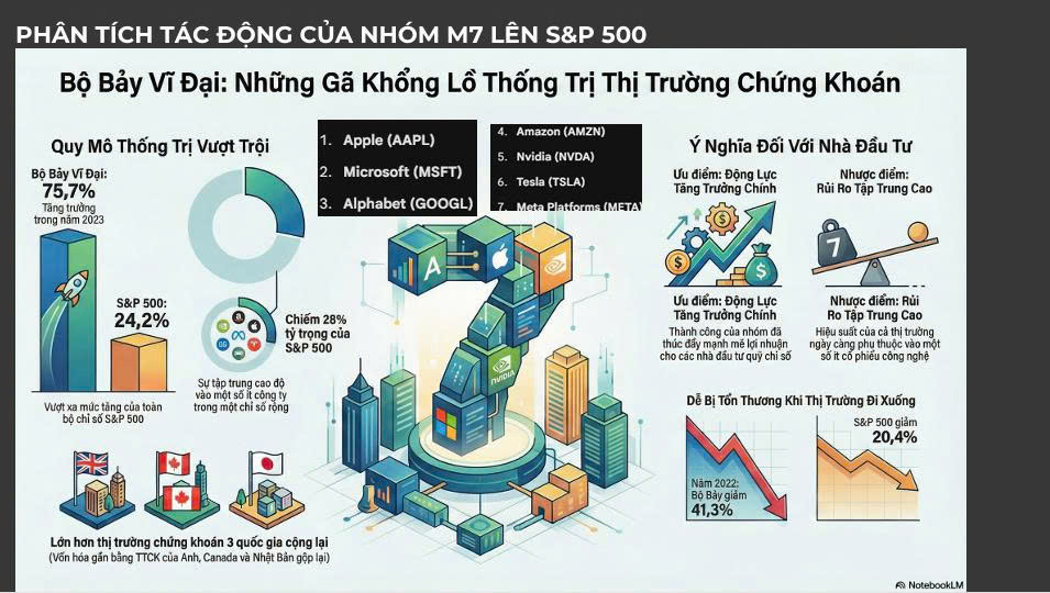 Tại Mỹ (Bộ Bảy Vĩ Đại – Magnificent Seven): Nhóm 7 cổ phiếu công nghệ (Apple, Microsoft, Google, Amazon, Nvidia, Tesla, Meta) chiếm tỷ trọng lớn và chi phối đà tăng/giảm của S&P 500