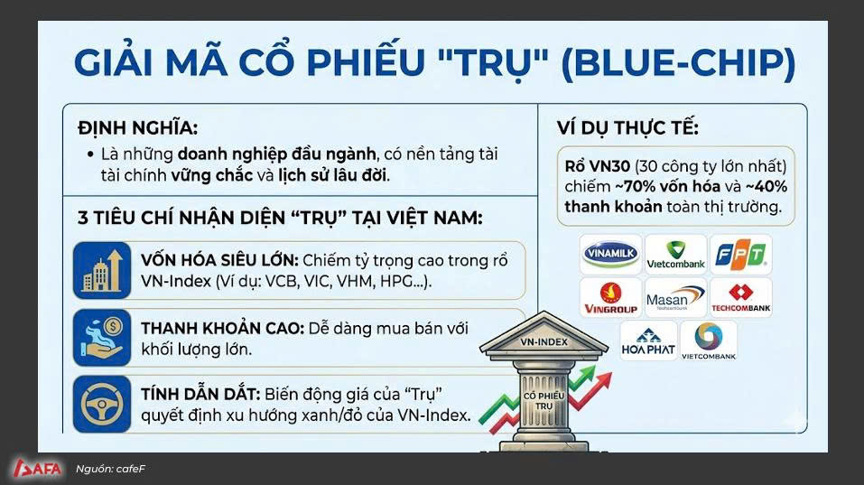 Tại Việt Nam: Các cổ phiếu “Trụ” được định nghĩa là doanh nghiệp đầu ngành, vốn hóa siêu lớn (trong rổ VN30), thanh khoản cao và có tính dẫn dắt (ví dụ: VCB, VIC, VHM, HPG)