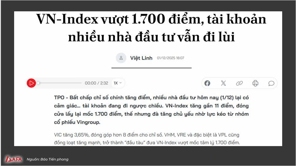 Khi VN-Index vượt mốc 1.700 điểm (tăng gần 11 điểm trong phiên 1/12/2025), nhưng tài khoản của nhiều nhà đầu tư vẫn “đi lùi”. Nguyên nhân được chỉ ra là đà tăng chủ yếu nhờ lực kéo từ nhóm cổ phiếu Vingroup (VIC, VHM, VRE, VPL), tạo ra hiện tượng “xanh vỏ đỏ lòng”.